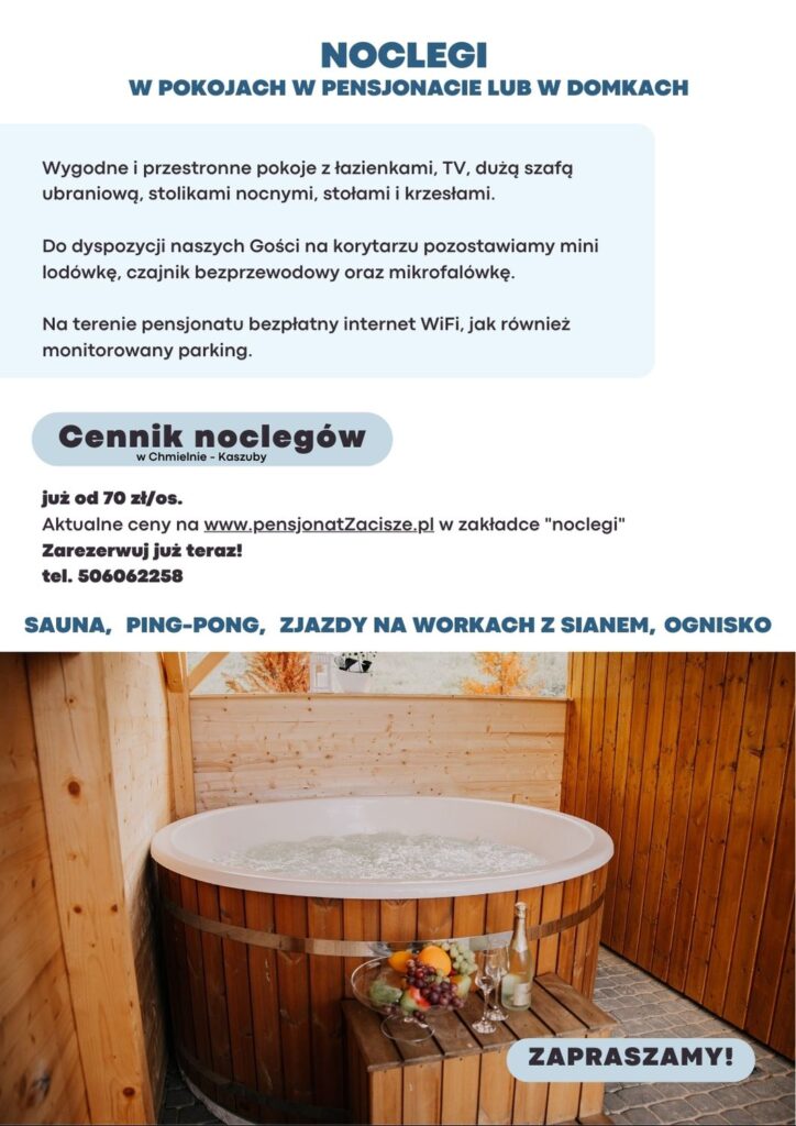 Ferie zimowe 2026 w Gościńcu Zacisze w Chmielnie to propozycja dla osób, które chcą odpocząć w spokojnym miejscu i spędzić kilka zimowych dni blisko natury. Na miejscu czekają przytulne pokoje i domki, codzienne śniadania, sauna oraz atrakcje dla dzieci i dorosłych. Po aktywnym dniu można ogrzać się przy ognisku, zagrać w ping-ponga, a najmłodsi mogą korzystać ze zjazdów na workach z sianem. Do dyspozycji gości są także wygodne pokoje z łazienkami i TV, a dodatkowo na korytarzu mini lodówka, czajnik i mikrofalówka. Nie brakuje też Wi-Fi, monitorowanego parkingu oraz domowych posiłków, deserów i kawy. Wokół rozciągają się lasy, jeziora i spokojna kaszubska okolica.